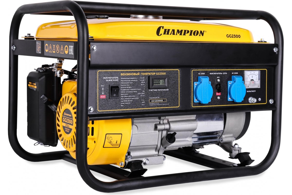 Генератор Champion (2,3/2.5кВт OHV 7лс 15л 37кг) GG2300 предназначен для снабжения электричеством приборов суммарной мощностью до 2,5 кВт. Подойдёт в качестве резервного источника питания для загородного дома или дачи. Небольшой расход топлива обеспечивает работу генератора в течение продолжительного времени.